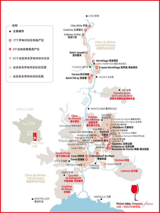 以蒙特利馬爾鎮(zhèn)(Montelimar)為界,沿羅納河綿延250公里的羅納河谷葡萄園被分成南北兩部分——北羅納河谷葡萄園(Northern Rhone Valley Vineyards)和南羅納河谷葡萄園(Southern Rhone Valley Vineyards)。不過,盡管都被冠以“羅納河谷”之名,但這兩部分卻仿佛同一位母親的兩個性格迥異的孩子,在氣候、土壤、葡萄品種以及葡萄酒風(fēng)格等方面千差萬別,甚至常常被當(dāng)作兩個不同的產(chǎn)區(qū)來對待。再加上南、北羅納河谷葡萄園各自內(nèi)部眾多更為細分的子產(chǎn)區(qū),共同造就了羅納河谷葡萄園和它所出產(chǎn)的葡萄酒豐富的多樣性。