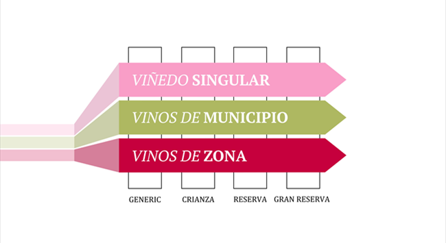 2017年,里奧哈法定產(chǎn)區(qū)監(jiān)管委員會(Rioja Consejo Regulador)在葡萄酒法規(guī)上推陳出新,新增了地理標簽制度。該地理標簽制度將葡萄酒分為單一園葡萄酒(Vinedo Singular)、村鎮(zhèn)級葡萄酒(Vinos de Municipio)和大區(qū)級葡萄酒(Vinos de Zona)三個等級,使葡萄酒更能突顯風(fēng)土特征。另外,此次更新也對原本的陳釀級別做了一些修改。原來的里奧哈葡萄酒根據(jù)陳釀年限分為新酒(Joven)、陳釀(Crianza)、珍藏(Reserva)與特級珍藏(Gran Reserva),在這次更新中,“Joven”更名為“Generic”(原產(chǎn)地保障)。