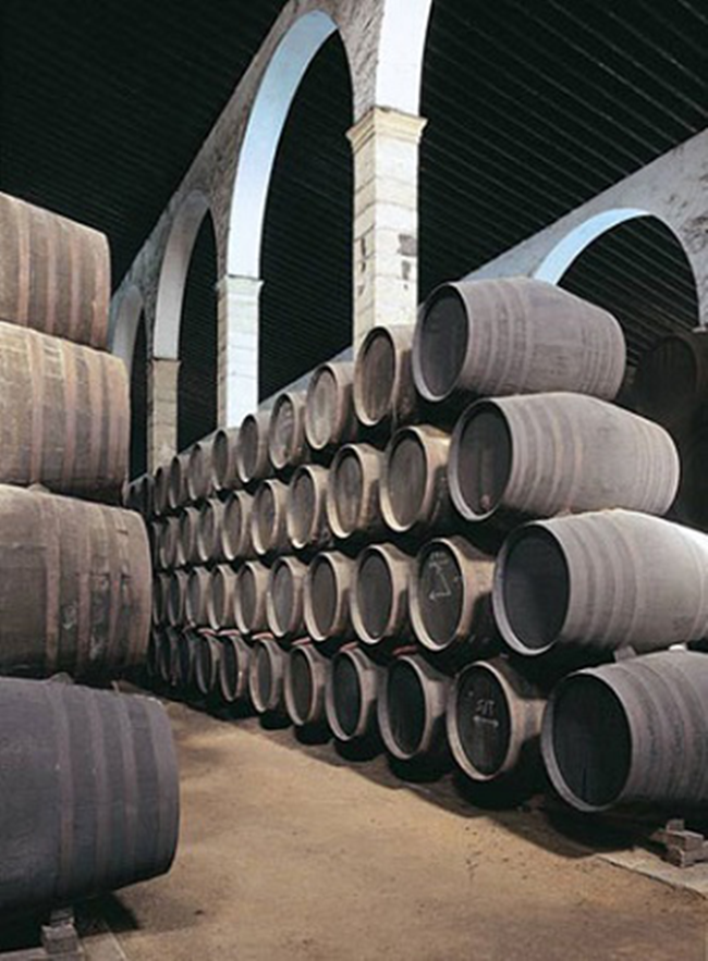 雪莉酒的強化發(fā)生在基酒發(fā)酵結束后,一般通過混入部分酒精濃度高達96%abv的蒸餾烈酒來將葡萄酒的酒精度提升至15-15.5%abv或17%abv。然后,酒液會轉入獨特的索萊拉(Solera)系統(tǒng)進行熟化。這種系統(tǒng)的特點在于將不同熟化期的酒液分層存放,然后在熟成過程中每隔一段時間就將年輕酒液與熟化較久的酒液混合,以保證每次釀出的雪莉酒風格一致,且品質穩(wěn)定。雪莉酒的風味大多源自該熟化階段,其風格也與熟化時長和熟化方式等息息相關。