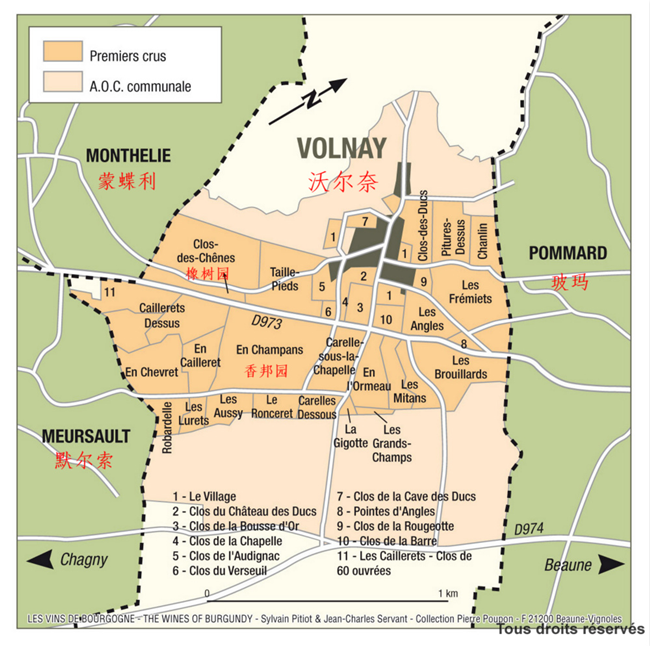 和很多伯恩丘的酒村一樣,沃爾奈沒(méi)有特級(jí)園(Grand Cru),但有幾塊一級(jí)園(Premier Cru)出產(chǎn)的葡萄酒品質(zhì)出色,有著“準(zhǔn)特級(jí)園”的稱號(hào)。