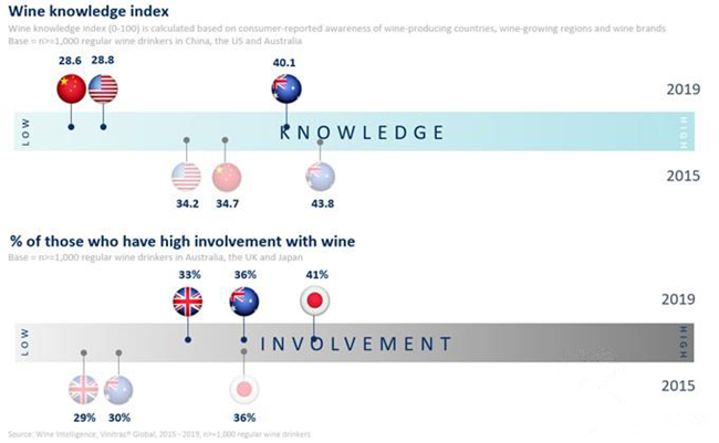 在主要市場中,澳大利亞和日本的葡萄酒市場在過去五年中增長最快。在日本,高參與度的葡萄酒消費者的比例已經(jīng)從2015年的36%上升到2019年的41%,而澳大利亞高參與度的葡萄酒消費者比例從30%上升到36%。