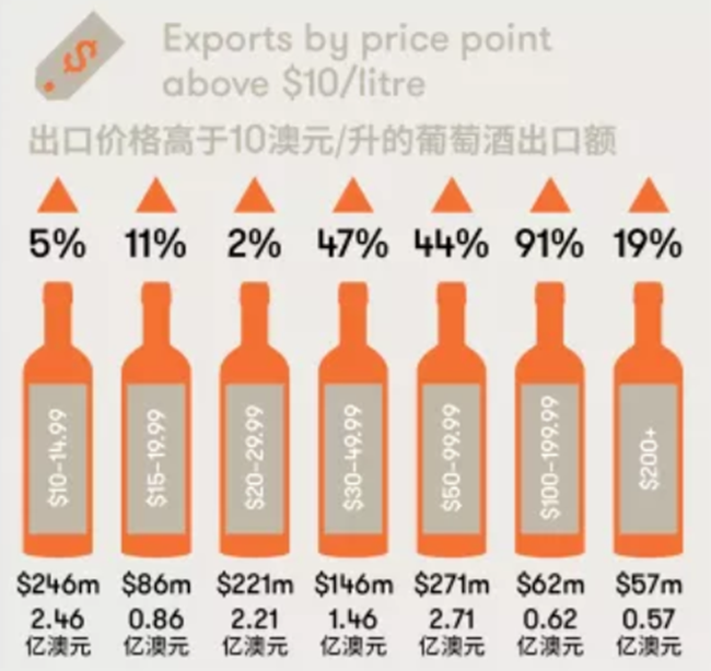 另外一個突出的部分是價格區(qū)間在30澳元或以上(離岸價)的葡萄酒出口額的增長,凸顯了市場對澳大利亞最優(yōu)質葡萄酒日益增長的需求。