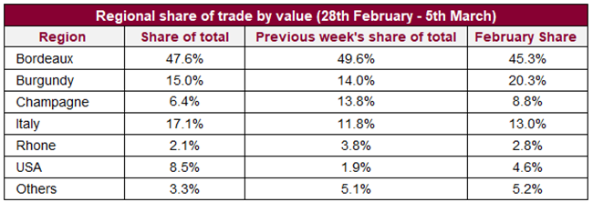 就交易總值份額而言,波爾多(47.6%)連續(xù)第二周低于指標(biāo)50%。 免關(guān)稅的意大利份額則躍升(17.1%);當(dāng)中2016年份占了該酒區(qū)交易超過(guò)55%。