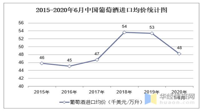 華經產業(yè)研究院數據顯示:2020年1-6月中國葡萄酒進口數量為22909萬升,相比上年同期減少了10638.1萬升,降幅為31.7%;進口金額為1105486千美元,相比上年同期減少了588716千美元,降幅為34.8%;2020年1-6月中國葡萄酒進口均價為48.26千美元/萬升。