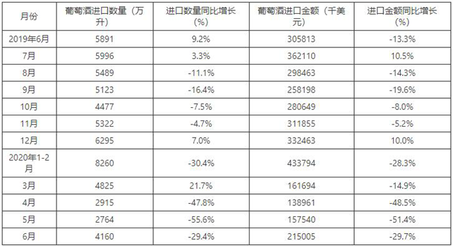 2015-2020年6月中國葡萄酒進口數量及增速