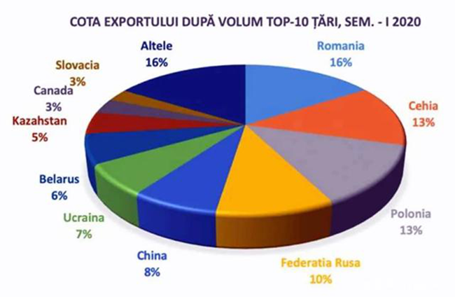 摩爾多瓦向56個國家和地區(qū)的出口總額為12.478億列伊, 比2019年前6個月下降了5.7%(即減少了7470萬列伊)。