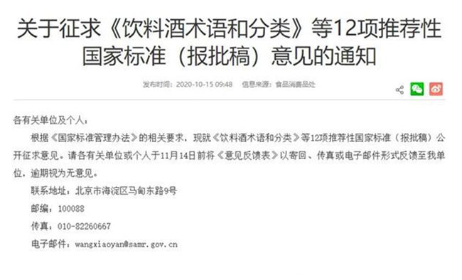 日前,國家市場監(jiān)督管理總局發(fā)布了“關(guān)于征求《飲料酒術(shù)語和分類》等12項(xiàng)推薦性國家標(biāo)準(zhǔn)(報批稿)意見的通知”,根據(jù)《國家標(biāo)準(zhǔn)管理辦法》的相關(guān)規(guī)定,《飲料酒術(shù)語和分類》等12項(xiàng)推薦性國家標(biāo)準(zhǔn)已完成報批稿,涉及釀酒、鹽業(yè)、白酒等標(biāo)準(zhǔn)化技術(shù)委員會。