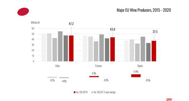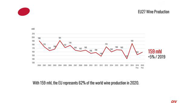 北半球2020年的采收并未受到因疫情封鎖措施的強烈影響。2020年,歐盟國家葡萄酒產(chǎn)量為159億升(mhl),占全球總產(chǎn)量的62%。