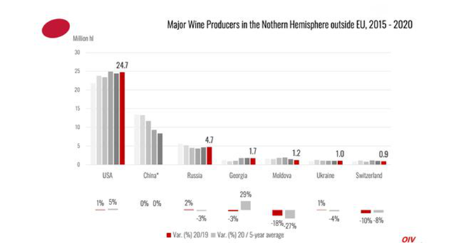 在歐盟以外的北半球,俄羅斯(4.7 mhl, +2%/2019)和烏克蘭(1.0 mhl, +1%/2019)等國家的2020年葡萄酒產(chǎn)量較高,而格魯吉亞和摩爾多瓦(經(jīng)歷干旱)的產(chǎn)量分別下降了1.7 mhl(-3%/2019)和1.2 mhl(-18%/2019)。