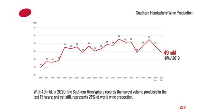 2020年,南半球的產(chǎn)量為49 億升(mhl),為過去15年的最低水平,仍占全球葡萄酒產(chǎn)量的21%。