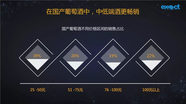 從消費(fèi)市場來看,國產(chǎn)葡萄酒銷量占比最大的價(jià)格區(qū)間集中在25-50元,其次是51-75元、76-100元。單價(jià)100元以內(nèi)的占據(jù)國產(chǎn)葡萄酒市場近八成。