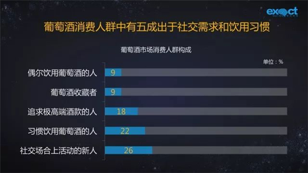 消費(fèi)者人群的構(gòu)成當(dāng)中,剛開始在社交場合上活動(dòng)的新人,和正逐漸形成葡萄酒飲用習(xí)慣的人群幾乎占據(jù)了整個(gè)人群的半壁江山。