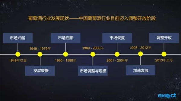 從產(chǎn)業(yè)發(fā)展的角度看,中國葡萄酒產(chǎn)業(yè)發(fā)展主要經(jīng)歷了7個(gè)階段,目前可以看出已邁入調(diào)整開放階段。