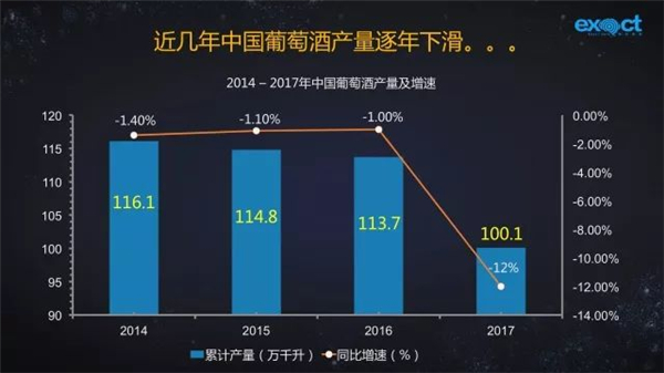 從統(tǒng)計(jì)數(shù)據(jù)看,2014-2017年,中國葡萄酒產(chǎn)量呈逐年下滑態(tài)勢。2017年中國葡萄酒產(chǎn)量為100.1萬千升,同比下滑12%。據(jù)業(yè)內(nèi)人士認(rèn)為,中國葡萄酒正處于調(diào)整優(yōu)化期,劣質(zhì)產(chǎn)能下滑,優(yōu)質(zhì)產(chǎn)能上升。一方面,進(jìn)口品牌對(duì)中國葡萄酒產(chǎn)業(yè)造成巨大沖擊;另一方面,低端低價(jià)競爭把國產(chǎn)葡萄酒逼入死胡同。