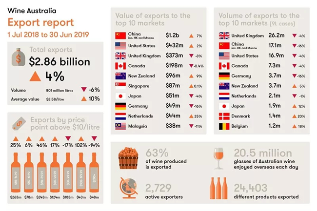 根據(jù)澳大利亞葡萄酒管理局(Wine Australia)公布的數(shù)據(jù),2019年前5個(gè)月,澳大利亞出口中國大陸的葡萄酒總價(jià)值首次超越法國,成為中國進(jìn)口葡萄酒的第一大來源國。