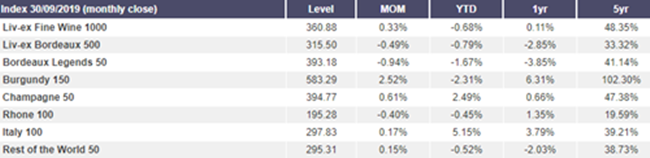 2019年至今,在,Liv-ex 1000(最廣泛衡量?jī)?yōu)質(zhì)葡萄酒市場(chǎng)表現(xiàn)的指數(shù))下跌了0.7%。 該指數(shù)在9月份上升0.3%,收于360.88點(diǎn)。