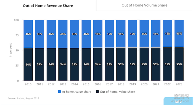 據(jù)統(tǒng)計(jì),目前全球在家庭中日常消費(fèi)的葡萄酒數(shù)量占葡萄酒總消費(fèi)量的71%,而消費(fèi)金額僅占全球葡萄酒總銷售額的45%。這也說明,餐廳、酒吧、體驗(yàn)式門店(Enoteca)等渠道中對(duì)于葡萄酒銷售而言意味著更大的利潤(rùn)空間。