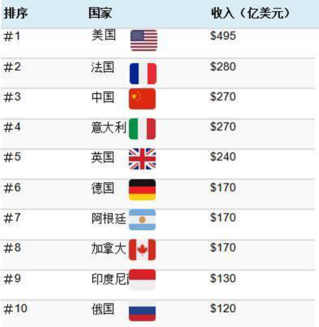 各個(gè)國(guó)家的葡萄酒銷(xiāo)售收入情況,單位是:10億美元。美國(guó)第一、中國(guó)第三。