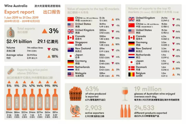澳大利亞葡萄酒協(xié)會(Wine Australia)今天上午發(fā)布的數(shù)據(jù)顯示,在截至2019年12月的12個月里,澳大利亞葡萄酒出口總額增長了3%,達到29.1億美元。