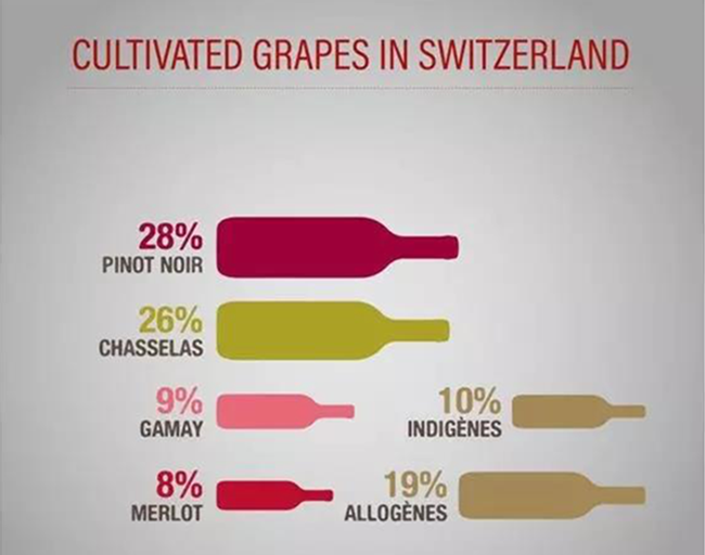 同樣,瑞士在選送的葡萄品種上也呈現(xiàn)出了多樣性,超過50多種。其中,瑞士的白葡萄之王莎斯拉(Chasselas)占據(jù)主導地位(133款),其次為黑皮諾(89款)和梅洛(37款),而本土品種佳瑪蕾(Gamaret,33款)和小奧銘(Petite Arvine,30款)也緊隨其后。36%的瑞士本土品種組成了這個國家多姿多彩的葡萄產業(yè)與文化。