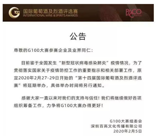 日前,G100大賽組委會(huì)以及深圳百高文化傳播有限公司發(fā)出公告,原定于在2月27-29日開(kāi)始的“第十四屆國(guó)際葡萄酒及烈酒評(píng)選賽”也將延期舉辦,具體舉辦時(shí)間將另行通知。